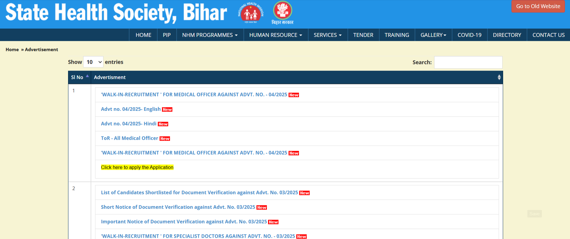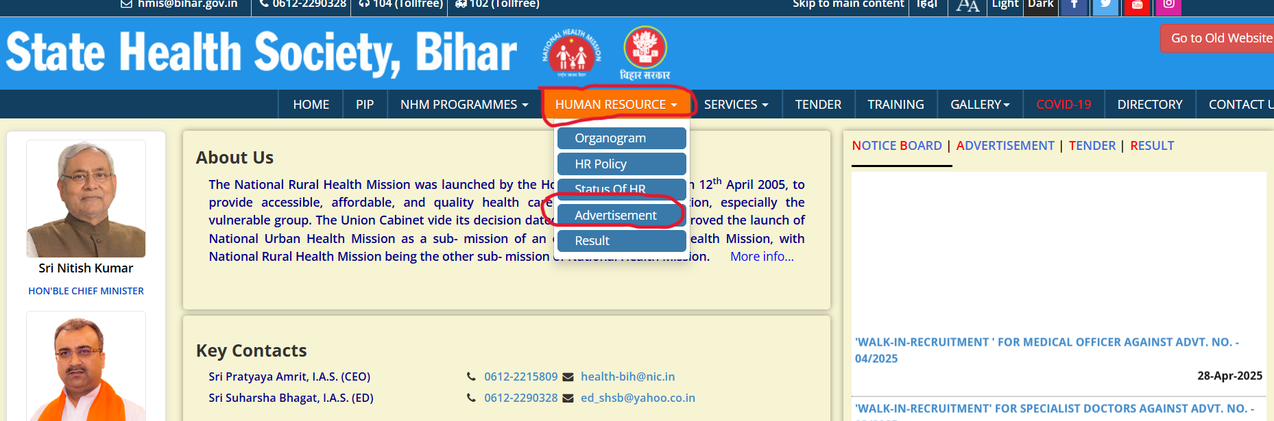 - भर्ती के तहत आवेदन करने के लिए उम्मीदवारों को सबसे पहले बिहार स्टेट हेल्थ सोसाइटी की आधिकारिक वैबसाइट पर जाना होगा।