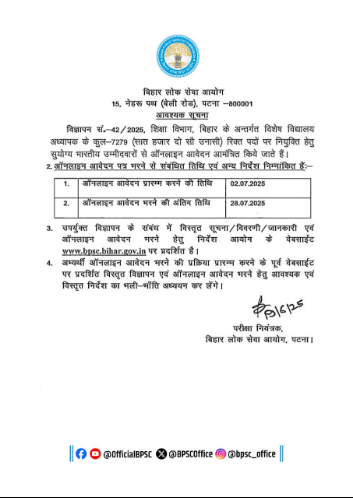 आप सभी को बता दे की इस Bihar Particular College Trainer Emptiness 2025 के लिए BPSC ने 19 जून 2025 को आधिकारिक अधिसूचना (विज्ञापन संख्या 42/2025) जारी की है। । सभी उम्मीदवार अभी इस भर्ती के ऑफिसियल नोटीफिकेशन का इंतजार करें, जैसे ही बीपीएससी द्वारा इस भर्ती के आधिकारिक नोटिस जारी किए जाएंगे, हम आपको सूचित कर देंगे। इसलिए आप हमारे सोशल मीडिया ग्रुप जॉइन कर ले, जिसका लिंक नीचे के टेबल मे दिया गया है।