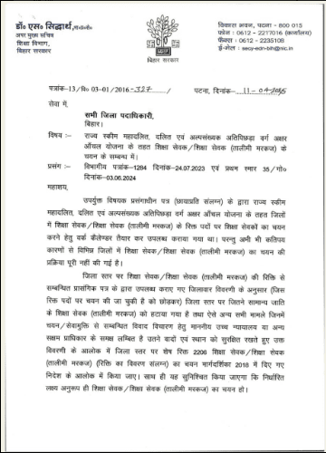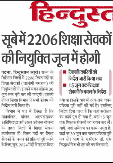बिहार टोला सेवक भर्ती 2025 का बेसब्री से इंतजार कर रहे सभी अभ्यर्थियोे के लिए नोटिफिकेशन जारी किया गया है जिसमे कहा गया है कि, राज्य स्कीम महादलित, दलित एंव अल्पसंख्यक अति पिछड़ा वर्ग अक्षर आंचल योजना के तहत जिलो मे शिक्षा सेवक / शिक्षा सेवक ( तालीमी मरकज ) के रिक्त पदोें पर शिक्षा सेवकोें का चयन करने हेतु वर्क कैलेंडर तैयार कर उपलब्ध करवाया गया था किन्तु अभी भी कतिपय कारणोें से विभिन्न जिलोें मे शिक्षा सेवक / शिक्षा सेवक ( तालीमी मरकज ) की चयन प्रक्रिया को पूरा नहीं किया गया है।