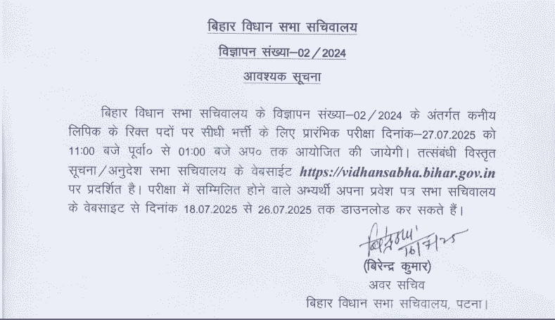 आपको बता दें कि, आजा 18 जुलाई, 2025 के दिन Bihar Vidhan Sabha Junior Clerk Admit Card 2025 को जारी कर दिया गया है।