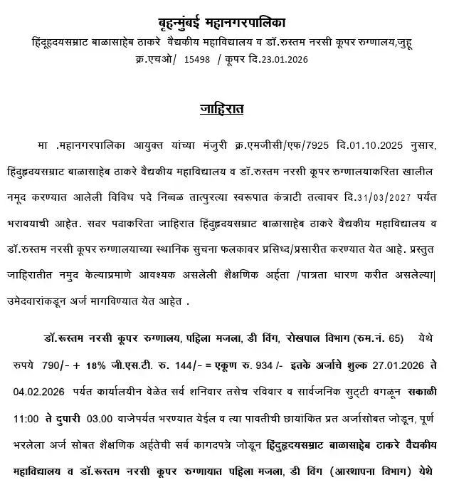 BMC Recruitment 2026: अगर आप भी मुंबई में सरकारी नौकरी की तलाश कर रहे हैं, और BMC के मेडिकल कॉलेज में मेडिकल, पारा मेडिकल या नॉन मेडिकल साइड से सरकारी नौकरी पाना चाहते हैं, तो आपके लिए एक अच्छी खबर आ गई है। आपको बता दें कि Brihanmumbai Municipal Company (BMC) के हिंदूहृदयसम्राट बालासाहेब ठाकरे वैद्यकीय महाविद्यालय व डॉ. आर. एन. कूपर रुग्णालय, जुहू ने हाल ही में एक नोटिफिकेशन जारी किया है। इस नोटिफिकेशन में मेडिकल, पैरा मेडिकल और अन्य स्टाफ के कुल 145 पदों के लिए आवेदन मांगे गए हैं।