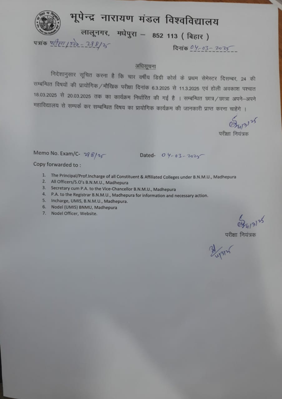 नमस्कार दोस्तों, यदि आप भी भूपेंद्र नारायण मंडल यूनिवर्सिटी से शैक्षणिक सत्र 2024-28 से स्नातक (B.A, B.Sc & B.Com) कर रहे हैं,तो आपको पता होगा, यूनिवर्सिटी के द्वारा आपका सेमेस्टर 1 की परीक्षा संपन्न कर दी गई हैं। अब प्रैक्टिकल विषयों की परीक्षा बाकी हैं। यूनिवर्सिटी ने प्रैक्टिकल परीक्षा का तिथि 06 मार्च 2025 से 11 मार्च 2025 तक निर्धारित किया था। परंतु होली को देखते हुए, यूनिवर्सिटी ने परीक्षा को रद्द कर दी हैं।