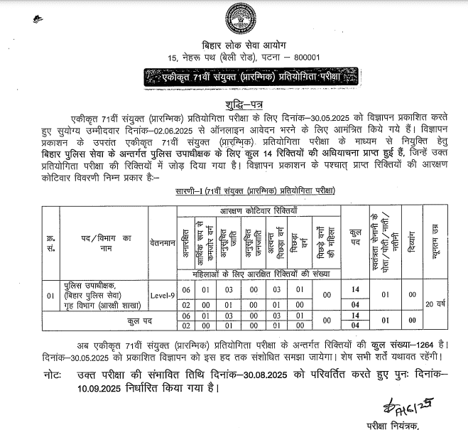 इच्छुक व पात्र अभ्यर्थियों को बता दें कि, एकीकृत 71वीं संयुक्ति ( प्रारम्भिक ) प्रतियोगिता परीक्षा 2025 के तहत बिहार पुलिस सेवा के अन्तर्गत पुलिस उपाधीक्षक के पदों मे 14 पदों की वृद्धि की गई है जिसकी वजह से पहले कुल पद 1,250 थे जो कि, बढ़कर 1,264 हो गए है और साथ ही साथ प्रारम्भिक / प्रीलिम्स परीक्षा तिथि – 30 अगस्त, 2025 को रद्द करके नई परीक्षा तिथि को घोषित किया गया है जिसकी पूरी जानकारी आपको आर्टिकल मे प्रदान की जाएगी तथा