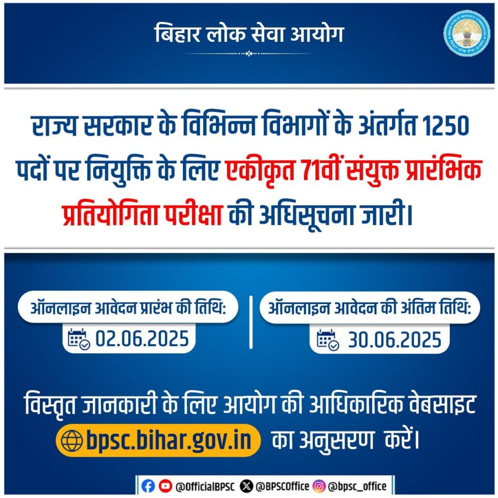 BPSC 71th Emptiness 2025: Bihar Public Service Fee (BPSC) के द्वारा Built-in 71th Mixed Aggressive Examination 2025 के लिए ऑफिसियल नोटिफिकेशन को जारी कर दिया गया है। इस परीक्षा के तहत BDO, DPO, Income Officer, Cooperative Officer, आदि के विभिन्न 1250 पदों पर भर्ती की जाएगी। जो भी योग्य एवं इच्छुक उम्मीदवार इस भर्ती के लिए आवेदन करना चाहते है, वह 02 जून 2025 से 30 जून 2025 तक आवेदन कर सकते है। सभी उम्मीदवार BPSC के आधिकारिक वेबसाईट bpsc.bihar.gov.in पर जाकर ऑनलाइन आवेदन कर सकते है।