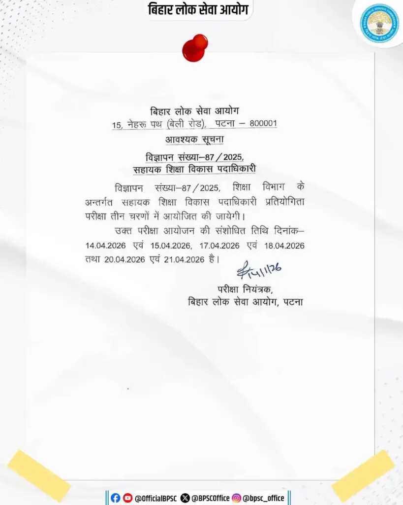दिनांक 10.01.2026 से 16.01.2026 (दिनांक 14.01.2026 को छोड़कर) तक आयोजित होने वाली विज्ञापन संख्या 87/2025 के अंतर्गत सहायक शिक्षा विकास पदाधिकारी (AEDO) की लिखित परीक्षा अपरिहार्य कारणों से स्थगित कर दी गई थी, जिसे अब पुनः संशोधित करते हुए परीक्षा का आयोजन दिनांक 14.04.2026, 15.04.2026, 17.04.2026, 18.04.2026, 20.04.2026 एवं 21.04.2026 को किया जाएगा।