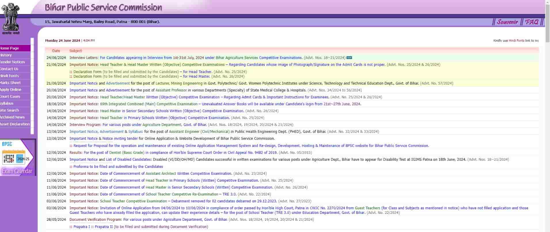 - BPSC Assistant Engineer Admit Card 2025 को चेक व डाउनलोड करने के लिए सबसे पहले बिहार पब्लिक सर्विस कमीशन ( बीपीएससी ) की Official Web site के होम – पेज पर आना होगा जो कि, इस प्रकार का होगा –