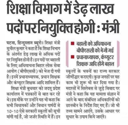 बिहार शिक्षक भर्ती 4.0 को लेकर बड़ी अपड़ेट आ रही है कि डेढ़ लाख पदो पर भर्ती लिया जाएगा तो आप सभी उम्मीदवारो के लिए एक ब़़डा मौका है अपना करियर बनाने का तो आज से तैयारी मे अपना 100% नही बल्कि 1000% दे क्योकि यह एक बड़ी मौका हो सकता है आप सभी के All The Besst