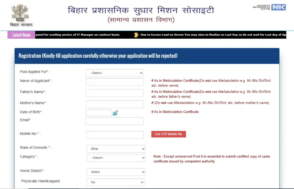 बिहार प्रशासनिक सुधार मिशन सोसाइटी के आधीन सुचना और प्रावैधिकी ने हालही में IT प्रबधक (Supervisor) के पदों के लिए भारतीय नागरिकों को आवेदन हेतु आमंत्रित किया था। ये आवेदन प्रक्रिया 02 अप्रैल 2025 को शुरू हो गई थी पर आधिकारिक वेबसाइट में तकनीकी समस्याएँ आ रही थी, जिस कारण उम्मीदवारों के फॉर्म नहीं भरे गए। अब इन पदों आवेदन की तिथि को 22 अप्रैल 2025 से बड़ा कर 07 मई 2025 कर दिया है।