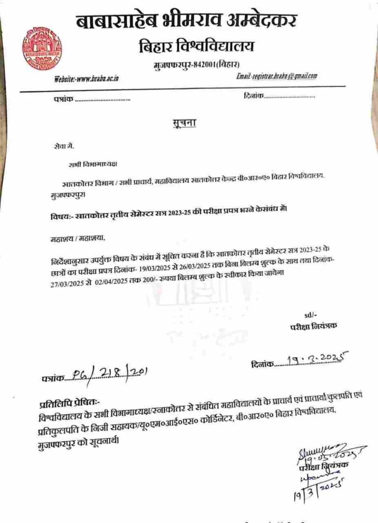 नमस्कार दोस्तों, बाबासाहेब भीमराव अंबेडकर बिहार यूनिवर्सिटी, मुजफ्फरपुर के द्वारा स्नातकोत्तर सत्र 2023-25 से करने वाले सभी विद्यार्थियों का तृतीय सेमेस्टर परीक्षा का फॉर्म भरना भरने के तारीख का ऐलान यूनिवर्सिटी के द्वारा कर दिया गया हैं, विद्यार्थी संबंधित कॉलेज में जाकर कर ऑफलाइन परीक्षा फॉर्म को भरेंगे। या विद्यार्थियों को अपने कॉलेज के ऑफिशियल वेबसाइट पर विजिट करना होगा।