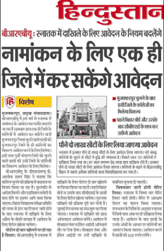 - दूसरी तरफ हम, आपको बता देना चाहते है कि, बीआरबीयू मे इस साल से स्नातक मे नामांकन के आवेदन का फॉर्मेट बदलने जा रहा है जिसके तहत इस बार छात्र एक ही जिले के कॉलेजोें मे आवेदन कर सकेगें जिसका अर्थ है कि, मुजफ्फरपुर जिला चुनने वाले छात्रोें को मुजफ्फरपुर जिले के ही कॉलेजों का विकल्प, आवेदन के लिए मिलेगा,