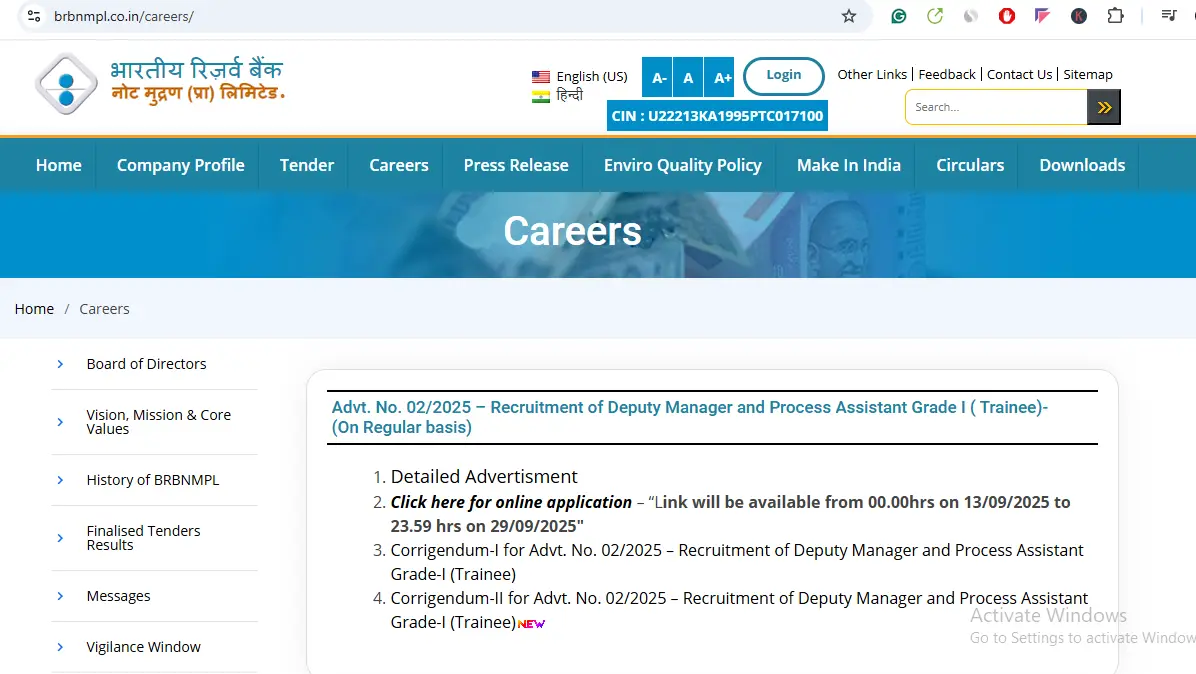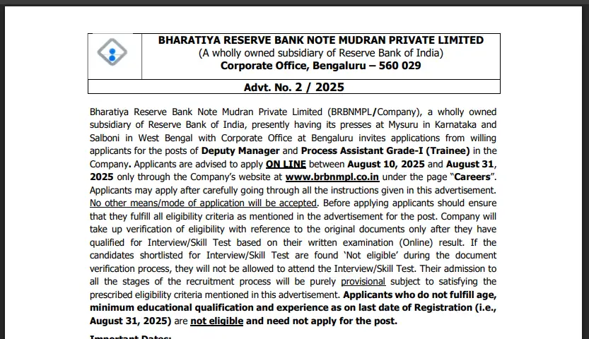 BRBNMPL Recruitment 2025 – भारतीय रिजर्व बैंक नोट मुद्रा प्राइवेट लिमिटेड (BRBNMPL) ने Advt.No 02/2025 जारी किया है जिसमें 88 रिक्तियां है। Deputy supervisor और Course of Assistant, Grade I trainee के पदों के लिए भर्ती निकली है। आपको बता दें की BRBNMPL Recruitment (Advt.No 02/2025) के लिए ऑनलाइन आवेदन की शुरुआत 10 अगस्त 2025 से हुई है तथा अंतिम तिथि 29 सितंबर 2025 कर दी गई है। इस नौकरी के लिए कोई भी ग्रेजुएट, डिप्लोमा, आईटीआई या 10वीं पास उम्मीदवार आवेदन कर सकता है। पद वार (post-wise) योग्यता अलग हो सकती है जिसकी जानकारी नीचे दी गई है। आज इस लेख में हम आपको vacancies की पूरी जानकारी, आयु सीमा, आवेदन शुल्क, और चयन प्रक्रिया जैसी आवश्यक जानकारी के बारे में बताने वाले हैं।
