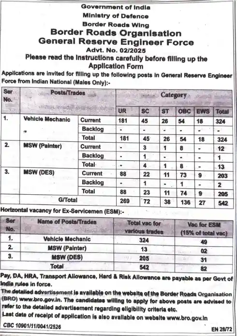 Border Roads Group (BRO) Ministry of Defence के अंदर ही आता है। BRO ने इस भर्ती के लिए शार्ट नोटिस Advt No. 02/2025 को इस हफ्ते की Employment information के जरिए जारी किया है। इस नोटिफिकेशन के अनुसार MSW (Painter), MSW (DES) और व्हीकल मैकेनिक के पदों पर कुल 542 रिक्तियों को भरा जाएगा, जिसमे से Car Mechanic की 324 रिक्तियाँ है, MSW (Painter) की 13 और MSW (DES) की 205 है।