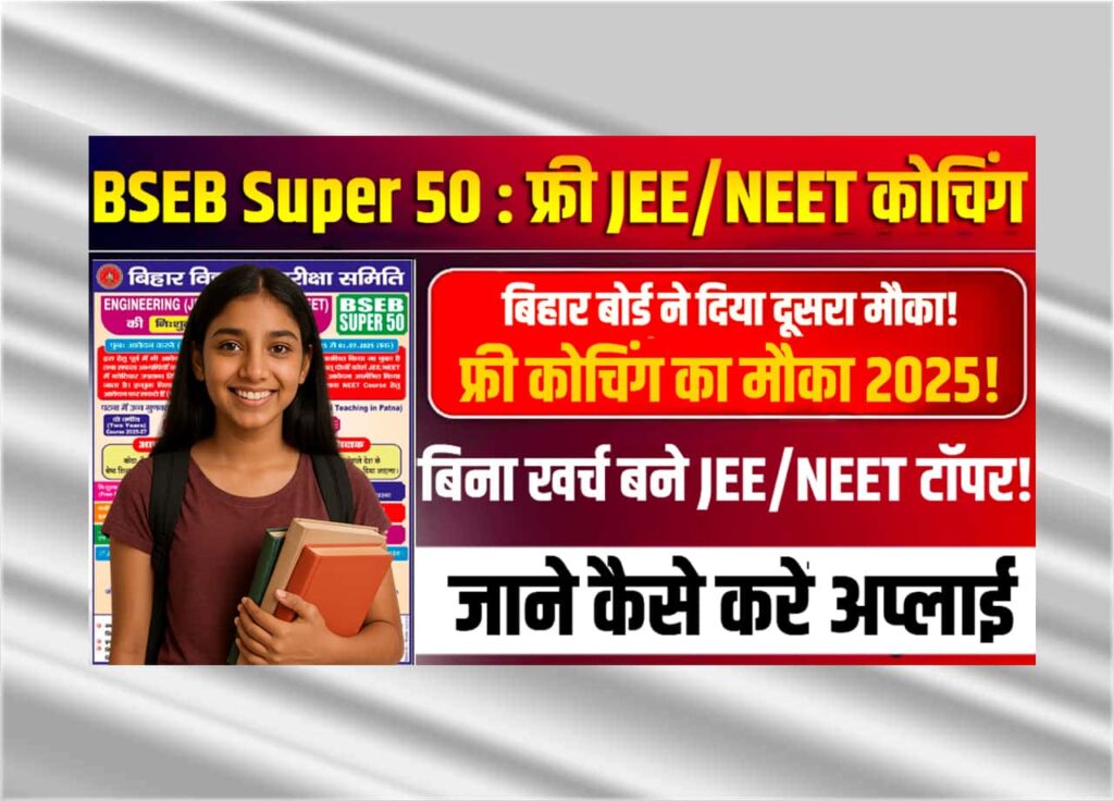 BSEB Tremendous 50 Free Teaching 2025: क्या आप भी बिहार बोर्ड के विद्यार्थी है जो कि, JEE / NEET की तैयारी हेतु फ्री कोचिंग का लाभ प्राप्त करना चाहते है तो आपके लिए बड़ी खबर है कि, बिहार बोर्ड द्धारा सभी स्टूडेंट्स केो जेईई / नीट की फ्री कोचिंग का लाभ पाने हेतु दुबारा से आवेदन फॉर्म भरने का मौका दिया गया है जिसका लाभ आप सभी मेधावी विद्यार्थी प्राप्त कर सके इसके लिए आपको आर्टिकल मे BSEB Tremendous 50 Free Teaching 2025 की जानकारी प्रदान करेगें।