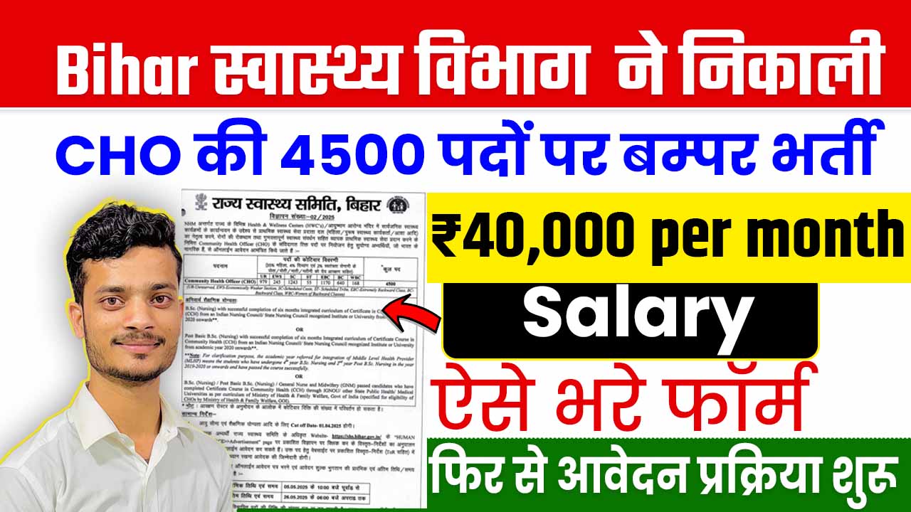 अपने इस आर्टिकल में आप सभी का स्वागत करते हुए बताना चाहूँगा की बिहार राज्य स्वास्थ्य सोसाइटी (BSHS) द्वारा सामुदायिक स्वास्थ्य अधिकारी (CHO) के 4500 पदों पर भर्ती निकाली गई है. 21 अप्रैल को बिभाग ने ऑफिसियल नोटिफिकेशन जारी किया था, जिसके अनुसार 05 मई 2025 (सुबह 10:00 बजे) से 26 मई 2025 (शाम 6:00 बजे) तक आधिकारिक वेबसाइट के माध्यम से योग्य उम्मीदवार ऑनलाइन आवेदन कर सकते हैं.
