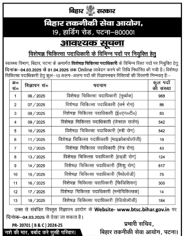 बीटीएससी ने निकाली स्पेशलिस्ट मेडिकल ऑफिशर्स की नई भर्ती जारी, जाने क्या है पूरी भर्ती, आवेदन प्रक्रिया और अप्लाई करने की लास्ट डेट – Bihar Specialist Medical Officer Emptiness 2025?