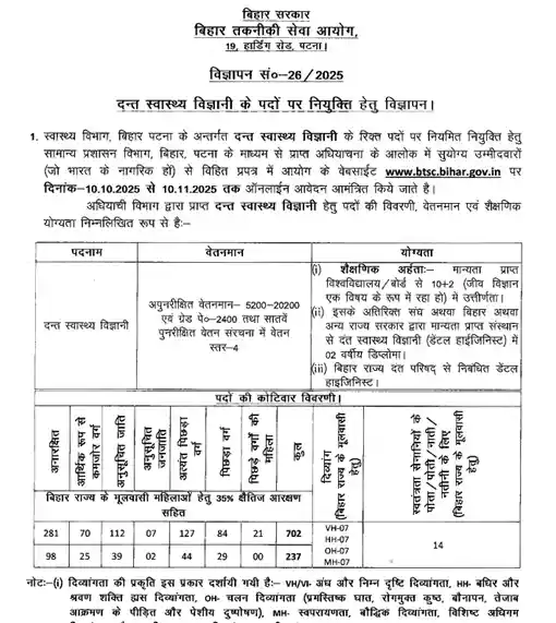वे सभी युवा जो बिहार स्वास्थ्य विभाग में Dental Hygienist के पदों के लिए अप्लाई करना चाहते हैं। उनका हमारे इस लेख में स्वागत है। आपको बता दें कि बिहार तकनीकी सेवा आयोग (BTSC) ने 4 अक्टूबर 2025 को एक शार्ट नोटिस जारी किया था जिसमे Dental Hygienist के 702 रिक्त पदों की घोषणा की थी। और अब BTSC ने 10 अक्टूबर 2025 को पूरा नोटिफिकेशन जारी की है। जिसमे कैटेगेरी वाइज पोस्ट और अन्य जरुरी जानकरियाँ बताई है।