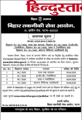अपने इस आर्टिकल मे आप सभी अभ्यर्थियों का स्वागत करना चाहते है जो कि, बिहार टेक्निकल सर्विस कमीशन के तहत सामान्य चिकित्सा पदाधिकारी ( जी.एम.ओ ) की भर्ती परीक्षा देने के बाद अपने – अपने रिजल्ट के जारी होने का इंतजार कर रहे है उन्हें आर्टिकल की मदद से विशेषतौ पर Bihar BTSC GMO Outcome 2025 को लेकर जारी प्रदान करना चाहते है जिसके लिए आपको अन्त तक इस आर्टिकल को पढ़ना होगा ताकि आप पूरी – पूरी जानकारी प्राप्त कर सकें।