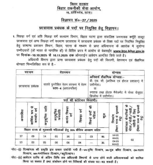 इस भर्ती में बिहार तकनीकी सेवा आयोग (BTSC) ने कुल 91 पद जारी किए हैं। इनमें सभी आरक्षित वर्गों और महिलाओं के लिए 35% क्षैतिज आरक्षण भी लागू किया गया है। यह भर्ती पिछड़ा वर्ग एवं अति पिछड़ा वर्ग कल्याण विभाग के अंतर्गत छात्रावासों में प्रबंधक पदों के लिए होगी।