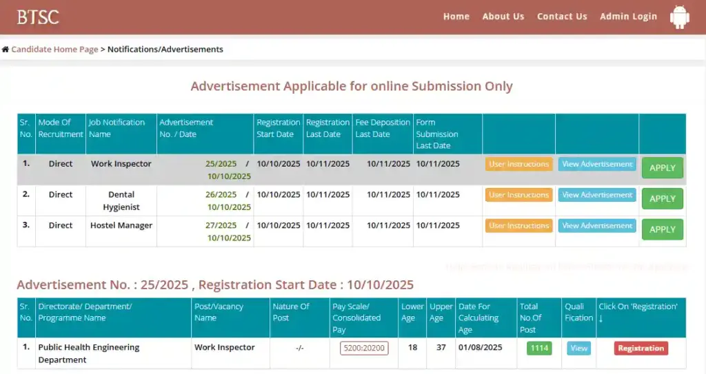 Apply On-line for BTSC Work Inspector Recruitment 2025?