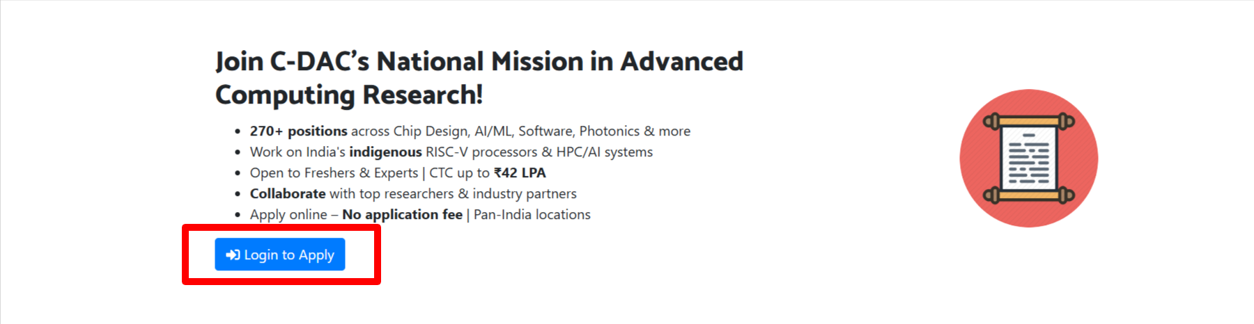 - इसके बाद आपके सामने C-DAC Recruitment Portal खुलकर आएगा यहाँ पर आपको Login To Apply के ऑप्शन पर क्लिक करना है।