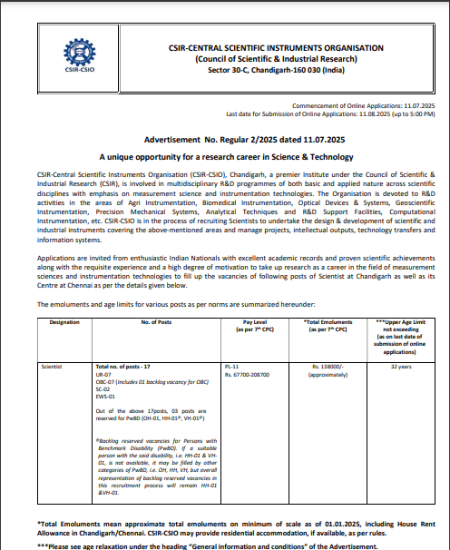 Obtain Official Commercial of Chandigarh CSIR CSIO Scientist Recruitment 2025 |