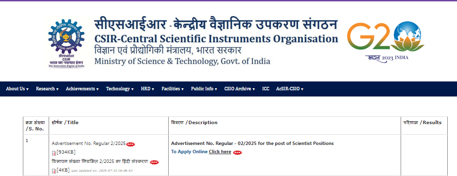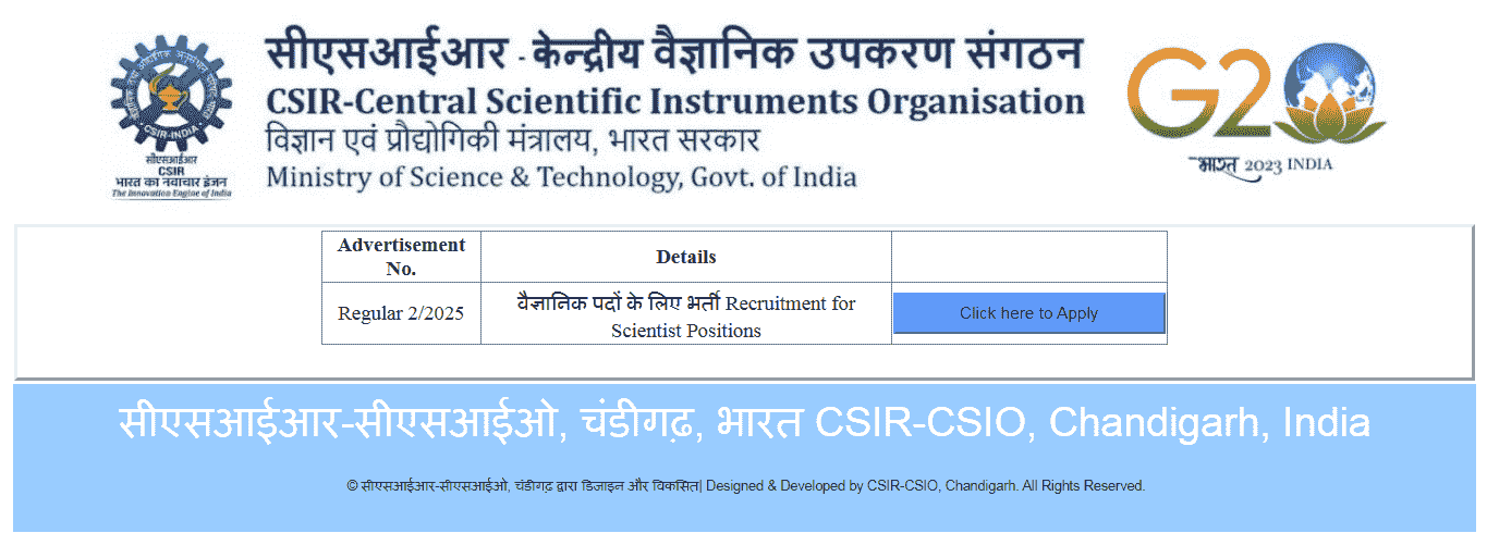 Direct Hyperlink To Apply On-line In Chandigarh CSIR CSIO Scientist Recruitment 2025 |