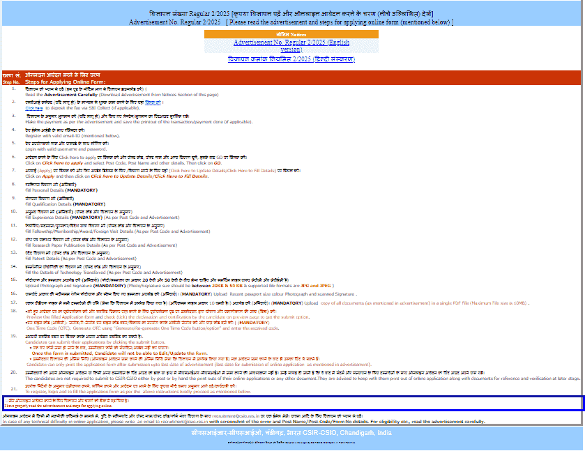 सभी युवा व आवेदक जो कि, चंड़ीगढ़ सीएसआईआर सीएसआईओ साईंटिस्ट रिक्रूटमेंट 2025 मे अप्लाई करना चाहते है उन्हें कुछ स्टेप् को फॉलो करना होग जो कि, इस प्रकार से है –