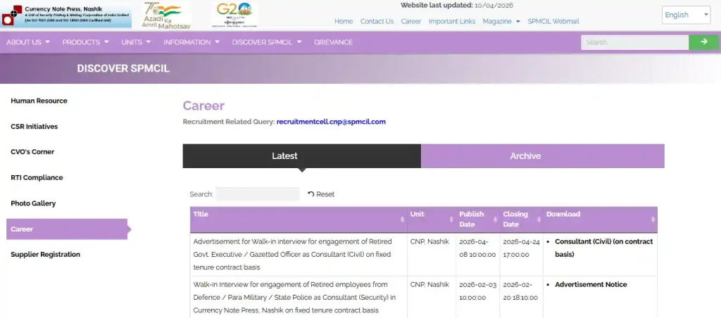 - सभी वैकंसी दिखेगी, यहाँ Recruitment Notification for CNP Nashik SPMCIL Junior Technician, Supervisor Varied Posts की ऑप्शन के सामने अप्लाई पर क्लिक करें। (अप्लाई 20 अप्रैल 2026 से शुरू होंगे)