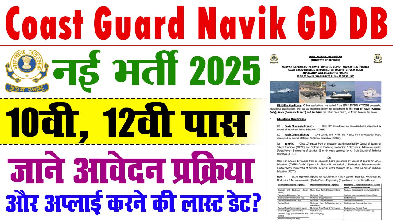 10वीं / 12वीं पास हेतु इंडियन कोस्ट गार्ड ने निकाली जीडी / डीबी की नई भर्ती, जाने क्या है पूरी भर्ती, क्वालिफिकेशन और ऑनलाइन अप्लाई करने की लास्ट डेट  – Coast Guard Navik GD DB Recruitment 2025?