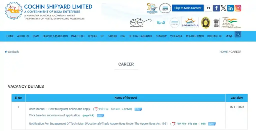 आपकी जानकारी के लिए बता दें कि अगर आपके पास ITI या टेक्निशन वोकेशनल कोर्स का सर्टिफिकेट है, तो आप इस अप्रेंटिस ट्रेनिंग भर्ती के लिए अप्लाई कर सकते हैं। इन पदों के लिए आवेदन आज यानी 29 अक्टूबर 2025 से शुरू हो गए हैं। और जो भी इच्छुक और योग्य उम्मीदवार हैं वे 15 नवंबर 2025 तक CSL की आधिकारिक वेबसाइट cochinshipyard.in पर जाकर ऑनलाइन माध्यम से आवेदन कर सकते हैं।