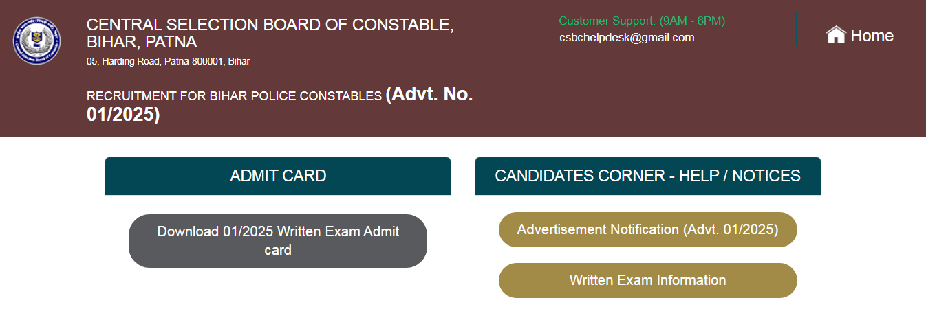 - CSBC Bihar Police Constable Admit Card 2025 को चेक व डाउनलोड करने के लिए सबसे पहले आपको इसकी Official Web site के होम – पेज पर आना होगा जो कि, इस प्रकार का होगा –