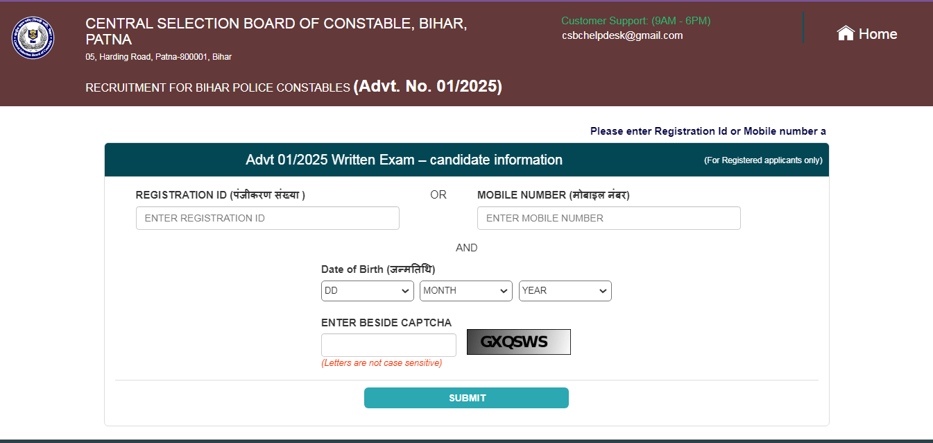 यहां पर आप सभी अभ्यर्थियों को बताना चाहते है कि, CSBC Bihar Police Constable Admit Card 2025 को चेक व डाउनलोड करने के लिए आपको अपने साथ अपना Registration Quantity & DOB Particulars को तेैयार रखना होगा ताकि आप आसानी से अपने – अपने बिहार पुलिस सिपाही एडमिट कार्ड 2025 को चेक व डाउनलोड करके भर्ती परीक्षा मे हिस्सा ले सकें तथा