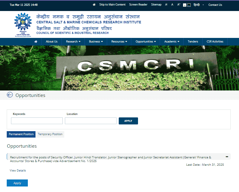 CSIR CSMCRI मे आई सिक्योरिटी ऑफिशर, जूनियर हिंदी ट्रांसलेटर और जूनियर स्टेनोग्राफर सहित विभिन्न पदोें पर नई भर्ती, जाने क्या है पूरी भर्ती और ऑनलाइन आवेदन प्रक्रिया – CSIR CSMCRI Recruitment 2025?
