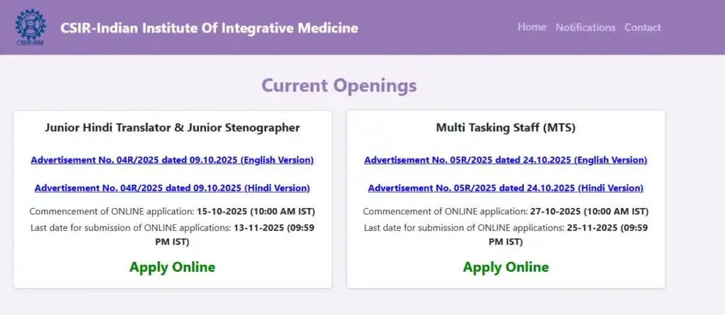 अगर आप भी CSIR IIIM MTS Recruitment 2025 के इन पदों के लिए आवेदन करना चाहते हैं, तो आपका हमारे इस लेख में स्वागत है। आपको बता दें कि CSIR-IIIM ने 24 अक्टूबर 2025 को इन पदों के लिए नोटिफिकेशन जारी की थी। इस नोटिफिकेशन के अनुसार इस भर्ती में कुल 19 Multi-Tasking Workers (MTS) रिक्तियों को भरा जाने वाला है। और इसकी आवेदन प्रक्रिया आज यानि 27 अक्टूबर 2025 से शुरू हो गई है।