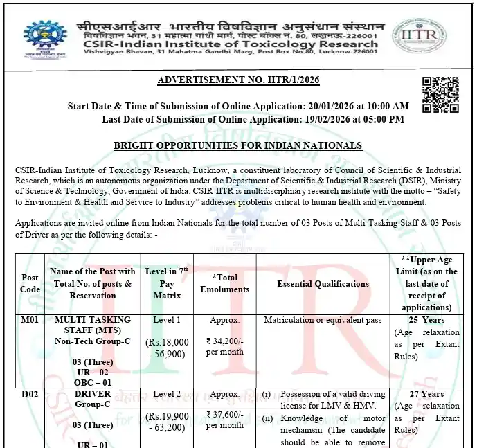 CSIR-IITR Advt No. IITR/1/2026 के अनुसार इस भर्ती में 3 पद MTS और 3 ही पद ड्राइवर के लिए निकले गए हैं, और जो भी उम्मीदवार इस भर्ती में सेलेक्ट होंगे उनको Pay Degree -1 MTS के लिए और Degree 2 Driver के लिए दी जाएगी। इस भर्ती की पूरी जानकारी नोटिफिकेशन में दी गई है जिसे हम आपको इस लेख में बताएंगे, तो आवेदन और अन्य जरुरी जानकारी के लिए लेख को अंत तक पूरा जरूर पढ़े।