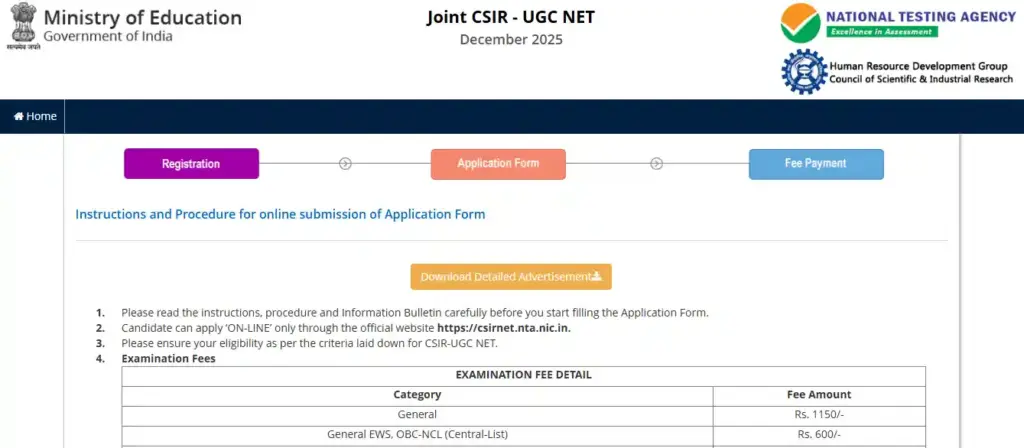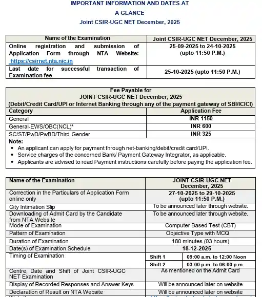 आपको बता दें की Nationwide Testing Company (NTA) ने इस CSIR UGC NET 2025 की परीक्षा के लिए 25 सितंबर 2025 से ऑनलाइन आवेदन की प्रक्रिया भी शुरू कर दी है। अगर आप भी परीक्षा के लिए आवेदन करना चाहते हैं, तो आप 24 अक्टूबर 2025 तक CSIR NTA की अधिकारी वेबसाइट csirnet.nta.nic.in पर जा कर आवेदन कर सकते हैं।