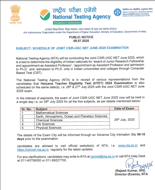 साथ ही साथ आप सभी अभ्यर्थियों को बता दें कि, नेशनल टेस्टिंग एजेंसी द्धारा 28 जुलाई, 2025 के दिन दो शिफ्टों मे CSIR UGC NET Examination 2025 का आयोजन किया जाएगा जिसके लिए NTA द्धारा 24 जुलाई, 2025 के दिन संभावित रुप से CSIR UGC NET Examination Metropolis Admit Card 2025 को जारी किया जा सकता जिसे चेक व डाउनलोड करने के लिए आपको अपने साथ अपने लॉगिन डिटेल्स को तैयार रखना होगा ताकि आप आसानी से अपने – अपने एडमिट कार्ड को चेक व डाउनलोड कर सकें।