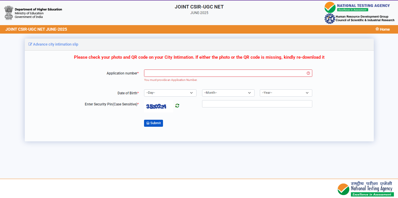 - होम – पेज पर आने के बाद आपको Joint CSIR-UGC NET JUNE-2025 : Click on Right here to Obtain Advance Metropolis Intimation Slip. का विकल्प मिलेगा जिस पर आपको क्लिक करना होगा,