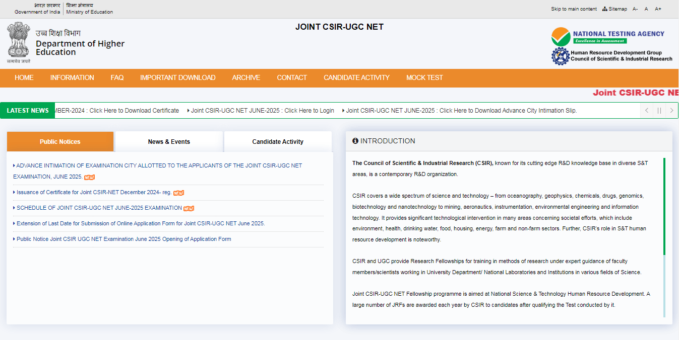 - CSIR UGC NET Examination Metropolis Admit Card 2025 को चेक व डाउनलोड करने के लिए सबे पहले आपको इसकी Official Web site के होम – पेज पर आना होगा जो कि, इस प्रकार का होगा –