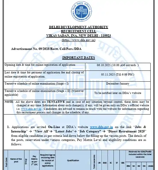 इस भर्ती की पूरी जानकारी आधिकारिक अधिसूचना में दी गई है जिसे हमने इस लेख में सरल हिंदी में बताया है। DDA Recruitment 2025 की पूरी जानकरी आपको सरल हिंदी में आगे लेख में मिल जाएगी। पात्रता मानदंड, आवेदन प्रक्रिया, चयन प्रक्रिया आदि के बारे में जानने के लिए लेख को अंत तक पढ़े।