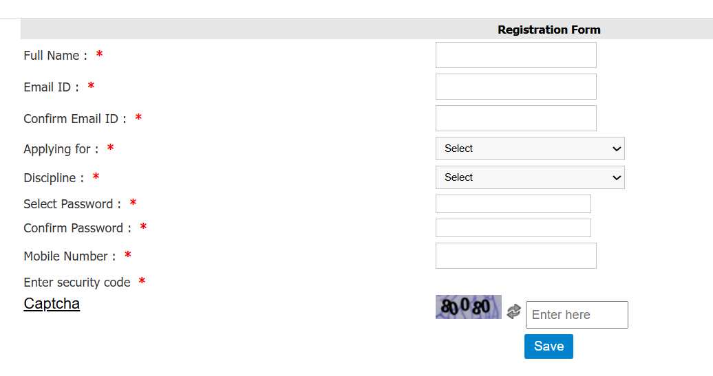 - इसके बाद में आपको रजिस्ट्रेशन फॉर्म दिखाई देगा जिसमें अपना नाम ईमेल आईडी कौन सी पोस्ट के लिए आवेदन कर रहे हैं पासवर्ड मोबाइल नंबर जैसी जानकारी दर्ज करके Save पर क्लिक करना है।