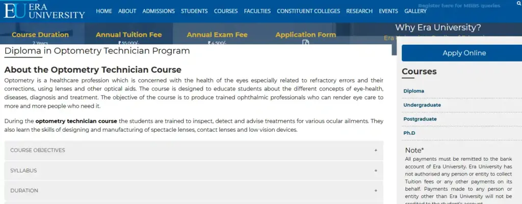 - सर्टिफिकेट कोर्स: कॉन्टैक्ट लेंस, लो विजन या ऑप्थैल्मिक इंस्ट्रूमेंटेशन जैसे छोटे प्रोग्राम।