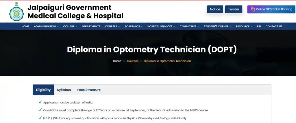 DOPT (Diploma in Optometry Technician) कोर्स एक पैरामेडिकल डिप्लोमा कोर्स है, जिसकी अवधि (Period) 1 से 3 साल की होती है। इस कोर्स में दाखिला लेने के लिए निम्नलिखित योग्यताएं जरूरी हैं: