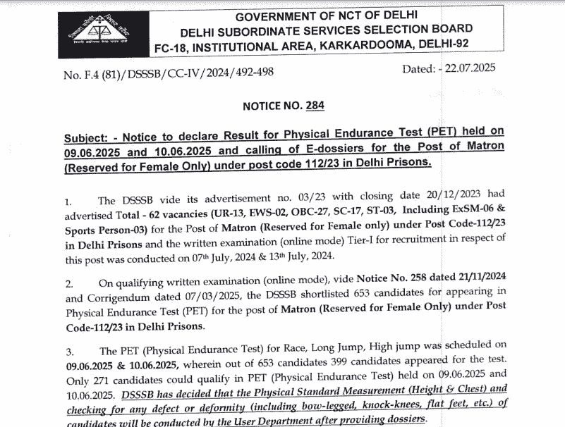 - अब इस पेज पर आपको NOTICE NO. 284 Discover to declare Consequence for Bodily Endurance Take a look at (PET) held on 09.06.2025 and 10.06.2025 and calling of E-dossiers for the Put up of Matron (Reserved for Feminine Solely) underneath submit code 112/23 in Delhi Prisons. का विकल्प मिलेगा जिस पर आपको क्लिक करना होगा,