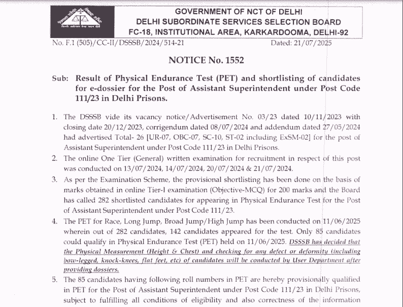 - अब इस पेज पर आपको NOTICE No. 1552 Results of Bodily Endurance Take a look at (PET) and shortlisting of candidates for e-dossier for the Put up of Assistant Superintendent underneath Put up Code 111/23 in Delhi Prisons. का विकल्प मिलेगा जिस पर आपको क्लिक करना होगा,