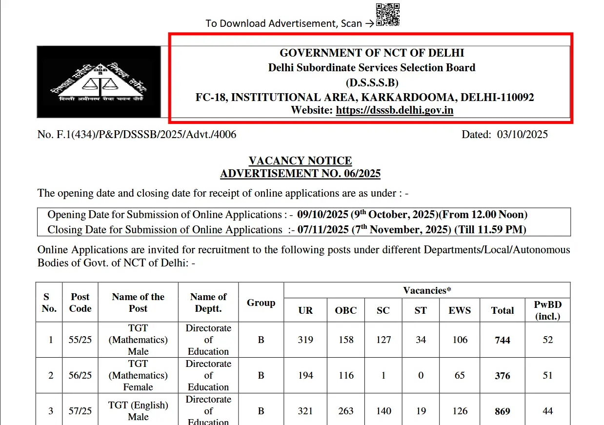 DSSSB TGT Recruitment 2025 | Notification Particulars