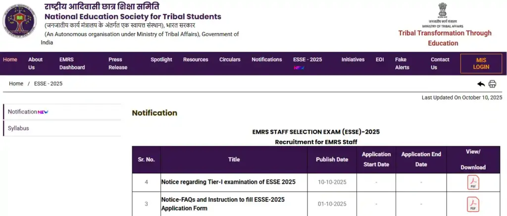 आपको बता दें कि यह EMRS के लिए Tier-I की परीक्षा 13 दिसंबर 2025, 14 दिसंबर 2025 और 21 दिसंबर 2025 को होने वाली है। NESTS ने 10 अक्टूबर 2025 को अपनी आधिकारिक वेबसाइट पर एक नोटिफिकेशन जारी किया है, जिसमे EMRS Examination की तिथि और Examination का शेड्यूल की जानकरी दी है। इस भर्ती के लिए Principal, PGT, TGT जैसे पदों के लिए पहले Tier-I परीक्षा होगी। और यह परीक्षा OMR आधारित होने वाली है। इसकी पूरी जानकारी आपको आगे लेख में मिल जाएगी।