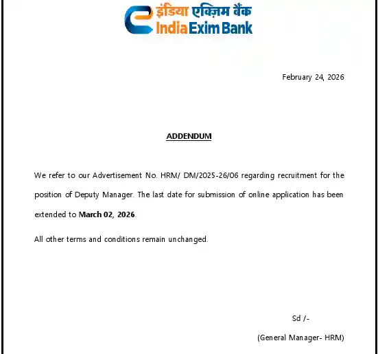 इस भर्ती के लिए ऑनलाइन आवेदन 26 जनवरी 2026 से शुरू हो चुके हैं। लास्ट डेट पहले 15 फरवरी थी, लेकिन अब बढ़ाकर 02 मार्च 2026 कर दी गई है। उम्मीदवार eximbankindia.in पर जाकर अप्लाई कर सकते हैं।