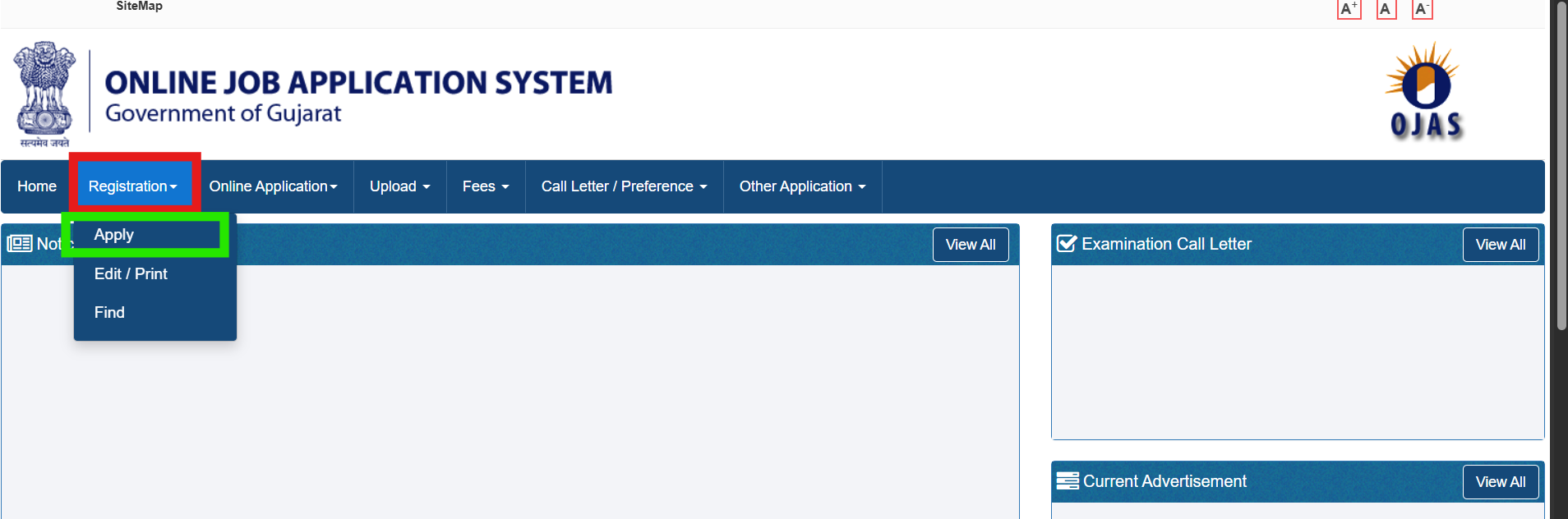 - भर्ती के तहत अपना ऑनलाइन आवेदन करने के लिए आपको सबसे पहले आधिकारिक वैबसाइट ojas.gujarat.gov.inपर जाना होगा।