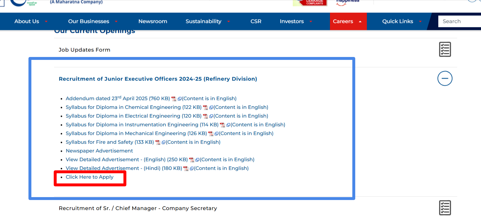 - जिसके बाद आपके सामने कुछ इस तरह का पेज खुलकर आएगा यहाँ पर आपको Recruitment of Junior Govt Officers 2024-25 (Refinery Division) के सेक्शन में नीचे दिये गए Click on Right here to Apply के ऑप्शन पर क्लिक करना है।